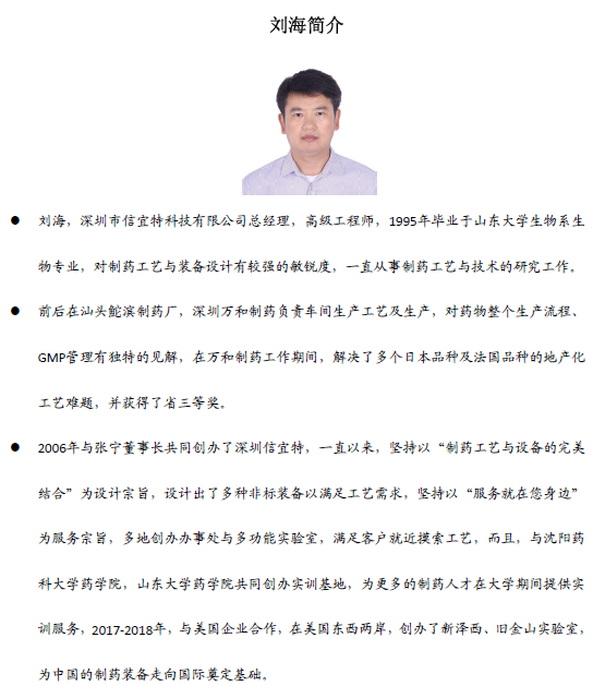 屆時(shí),深圳信宜特為了回饋客戶,除了提供專業(yè)制藥裝備服務(wù)之外,特邀沈陽(yáng)藥科大學(xué)崔福德教授,聊城大學(xué)生物制藥研究院院長(zhǎng)韓軍教授,浙江大學(xué)藥學(xué)院李文龍博士,沈陽(yáng)達(dá)善醫(yī)藥研發(fā)總監(jiān)姜海濤博士,北京中醫(yī)藥大學(xué)徐冰博士,長(zhǎng)沙晶易醫(yī)藥研發(fā)總監(jiān)張海龍等數(shù)名國(guó)內(nèi)專注于固體制劑工藝研究的實(shí)戰(zhàn)專家學(xué)者,為客戶面對(duì)面解答行業(yè)問(wèn)題,專家將從粉體/顆粒學(xué)基礎(chǔ)理論介紹,到“一致性”工藝開發(fā)要領(lǐng),最后實(shí)現(xiàn)穩(wěn)定可靠的產(chǎn)業(yè)化數(shù)據(jù),多方面,深層次,以“高效仿制與產(chǎn)業(yè)化”為主旨進(jìn)行探討,解讀及案例分析。歡迎制藥同仁踴躍報(bào)名參會(huì)。